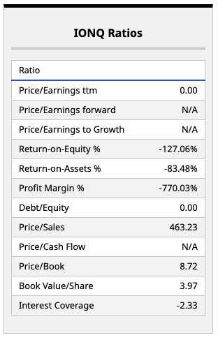 Now, as I mentioned, these metrics are largely meaningless. Most investors will ignore any discussion around fundamentals for IonQ, as there really aren't any. For this company and its future prospects, investors will spend much more time and energy parsing earnings calls and interviews from IonQ's brass to find clues about its timeline to commercialization and future growth prospects once the company's technology has been commercialized.