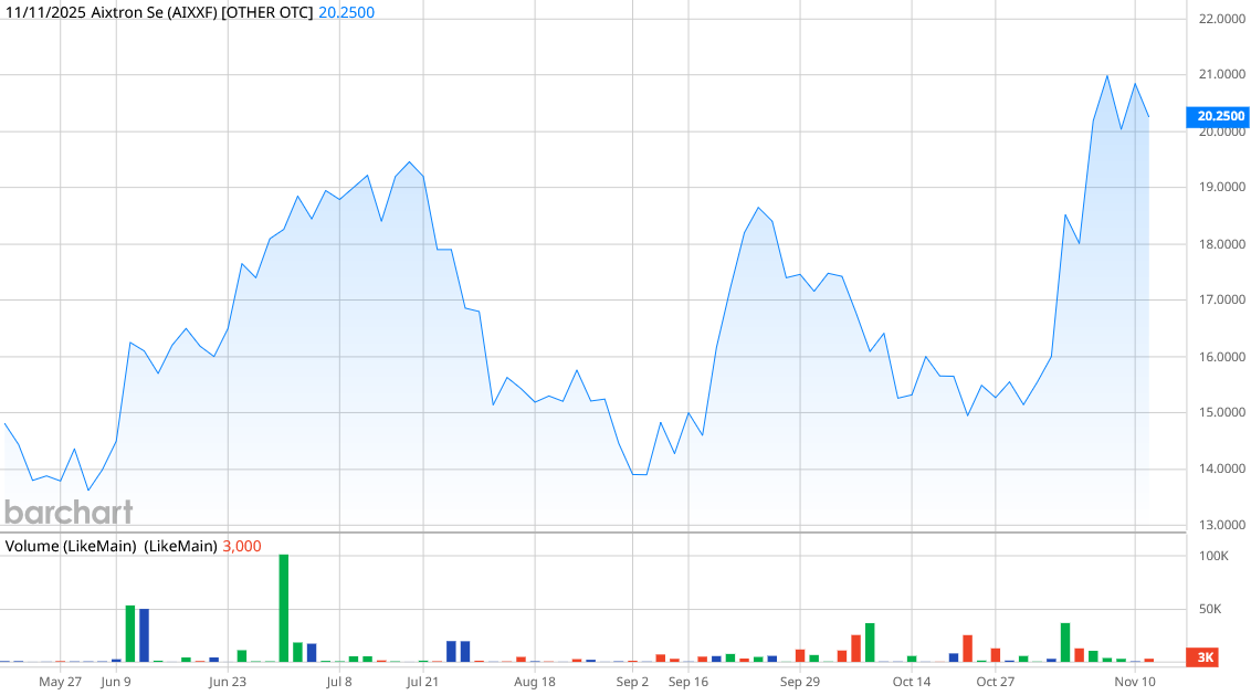 The answer lies in some analyst sentiment. While Aixtron doesn’t get the analyst coverage of stocks that are trading on major U.S. exchanges, it did get an upgrade from Barclays, which upgraded its rating from “Equal Weight” to “Overweight” and raised its price target from 12 euros per share to 20 euros per share. Analysts said that continued AI growth will likely help the company’s gallium nitride business.