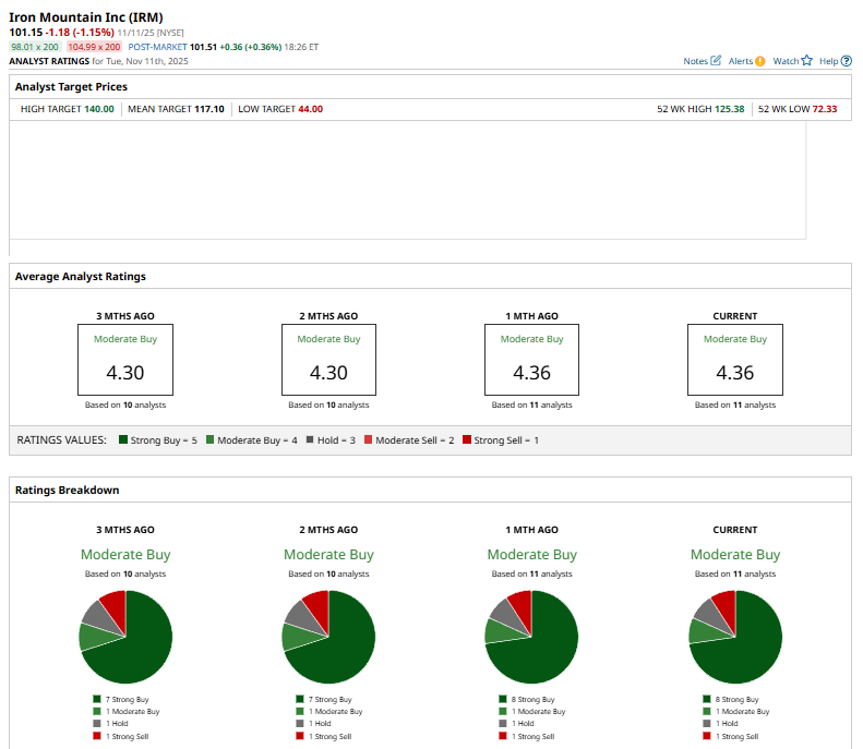 On Nov. 6, JPMorgan’s Andrew Steinerman lifted his price target on Iron Mountain to $111 from $100 and reiterated an “Overweight” rating, noting that the company’s Q3 results came in largely as expected with no major surprises.